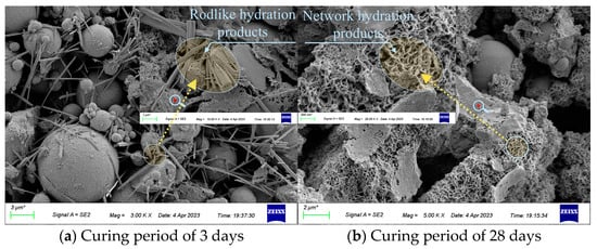 The microstructure of the fiber-reinforced ecological-matrix-cemented aeolian sand backfill was obtained by SEM scanning, and the strength formation mechanism of ecological-cementitious materials was revealed; the influence of the internal microstructure of the samples on the overall macro-properties of the materials was analyzed. Figure 7 shows the micro-morphology of the samples at different ages.
