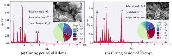 As can be seen from Figure 7a, when the curing age of the sample is 3 days, spheres (fly ash) are clearly visible in the Figure, and a large number of rod-shaped hydration products coexist. In an alkaline environment, covalent bonds such as aluminum–oxygen bonds and silicon–oxygen bonds in a high-energy state are broken by OH- ions. Free-moving Si monomers [SiO(OH)3]− and Al monomers [Al(OH)4]− are released from the surface of fly ash and slag, and the dissolved Si and Al monomers continue to self-organize and reconstruct through dehydroxylation. There are three ways to combine these two ion groups, but according to Lowenstein’s rule [40], 4-coordinated Al cannot be directly connected, and two [Al(OH)4]− cannot undergo a polycondensation reaction. Therefore, the polycondensation reaction of these two ionic groups has only two combinations: two [SiO(OH)3]− polycondensation or one [SiO(OH)3]− polycondensation combined with one [Al(OH)4]− polycondensation. Because this process reduces the concentration of free Si and Al monomers in the system, it further promotes the dissolution of aluminosilicate materials. With the reaction continuing for 28 days, these oligomers further condense to generate a three-dimensional reticulated polysilicate gel composed of [SiO4] and [AlO4] tetrahedrons, which gradually coagulate and harden to form a polymer block material, as shown in Figure 7b. This results in a large number of reticulated hydration products, with C-S-H and C-A-S-H becoming closely intertwined. The formation mechanism of the eco-gel matrix is shown in Figure 8, and the EDS spectra of samples at 3 days and 28 days are shown in Figure 9 [41].
