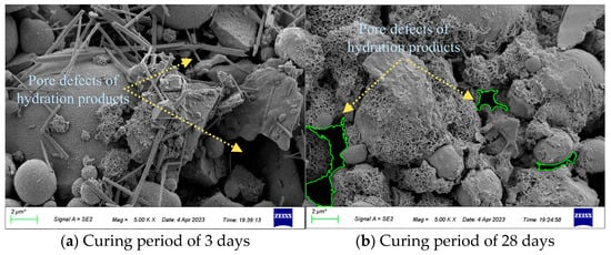 According to the Aim and Goff model theory, when the alkali-activated composite material mixed with superfine admixture is regarded as a multi-component system, there is the most compact packing in the system, and the slag in the backfill is finer than the fly ash. After replacing part of the fly ash, the amorphous slag particles fill the pores between the spherical fly ash particles, which results in the cementitious material having a better gradation and forming a compact packing structure and a meso-level self-compact packing system. As shown in Figure 10a, when the backfill is cured for 3 days, there is a small amount of hydrated calcium silicate (C-S-H) gel and a small amount of hydrated calcium aluminosilicate (C-A-S-H) gel in the particle skeleton of aeolian sand in the system, creating a certain bonding force between the aeolian sand particles. However, a large number of cementitious materials and aeolian sand particles that have not undergone geo-agglomeration accumulate, resulting in obvious voids, and the structure of the backfill material is relatively loose.