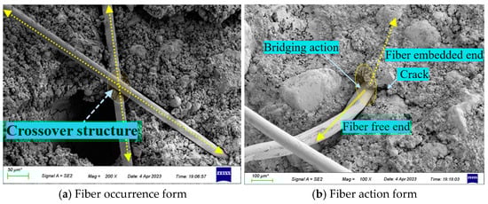 The fiber-reinforced ecological-matrix-cemented aeolian sand backfill is different from the general geopolymer-stabilized aeolian sand material. From a macro perspective, in the mixed matrix, the fiber is small, and the specific surface area is large. When an appropriate amount of fiber is added to the sample, the fibers are evenly distributed inside the matrix, and a three-dimensional network random support system can be formed inside it. As shown in Figure 11a, the fibers act as a spatial network bridge. When the load on the sample is transmitted to the point where the fibers overlap with each other, the cross-lapping point produces relative dislocation under the action of external force, and other interspersed fibers limit the initiation of deformation, thereby dispersing the local stress and forming a three-dimensional space. The stress zone can ideally disperse the external load to other areas inside the sample and reduce the stress concentration inside the sample. This realizes the effect of sharing stress and improves the overall stability.