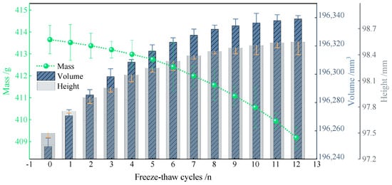As can be seen from Figure 12, with the increase in freeze–thaw cycles, the height and volume of the sample gradually increase. When the freeze–thaw cycles exceed six times, the height and volume of the sample remain relatively stable. This indicates that after more than six freeze–thaw cycles, the interior of the sample undergoes significant adjustment and reaches a new balance. With the increase in the number of freeze–thaw cycles, the internal structure of the sample changes irreversibly, and damage accumulates continuously. From the macroscopic test phenomenon, it can be seen that the surface peeling of the backfill sample occurs throughout the freeze–thaw-cycle process. This phenomenon is characterized by a loss of sample mass, with the mass decreasing gradually as the number of freeze–thaw cycles increases: the more cycles, the faster the mass decreases. This occurs because, during the freeze–thaw cycle, a temperature gradient forms inside and on the surface of the sample, causing moisture within the sample to migrate towards the colder outer surface, where ice crystals then form. The migration of water will cause the surface moisture content of the sample to reach a saturation state. Under the action of negative temperatures, a significant frost-heaving force is initially generated near the outer surface of the sample, which destroys the cement between loose particles in the internal system of the sample. When the temperature rises, the ice crystals near the outer surface of the sample melt first and flow out through pores and cracks, reducing the mass of the sample. From a microscopic perspective, the freeze–thaw cycle causes irreversible expansion of pores in the sample and reduces its strength. With changes in the sample’s mass, its mechanical properties also change due to the freeze–thaw cycle. The mass loss rate is introduced here and is calculated using Equation (3).