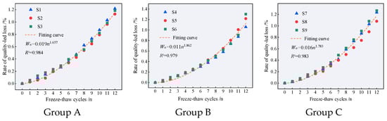 The data in Table 8 show that the relationship between the mass loss rate of the sample and the number of freeze–thaw cycles obeys the power function distribution. The data in the table were fitted and analyzed by Equation (7), and the fitting curve is shown in Figure 13.