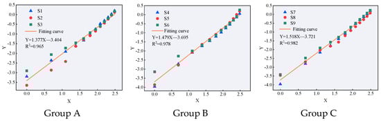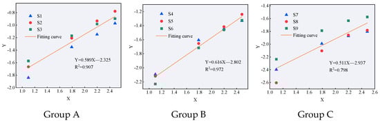 The fitting equation in Figure 13 is substituted into Equation (5) to obtain the freeze–thaw damage variables of samples in groups A, B, and C, as shown in Equation (6)–(8):