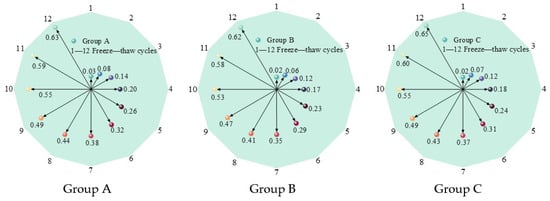 According to Formula (3), the mass loss rate of each sample under each number of freeze–thaw cycles is calculated, and the results are shown in Table 8.