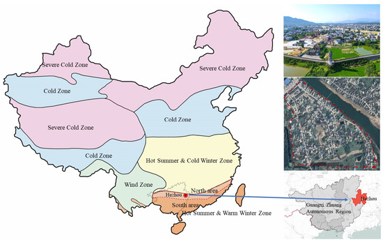 With its extensive landmass, diverse climates, complex landforms, and huge economic and cultural disparities across regions, the thermal design code for civil buildings [31] categorizes China’s climate across five zones: a hot summer and warm winter zone (HSWW), a hot summer and cold winter zone (HSCW), a severe cold zone (SC), a cold zone (C), and a mild zone (M). An HSWW zone refers to the area in which the average outdoor temperature of the coldest month exceeds 10 °C, while the hottest month’s average outdoor temperature ranges from 25 to 29 °C. It consists of northern and southern areas. The heating degree day based on 18 °C (HDD18) ranges from 500 to 700 °C in the north area, while it is below 500 °C in the south area of the HSWW zone. The HSWW zone usually experiences high temperatures and humidity in summers all year around, as well as short, cold winters (not even cold). Residential buildings in this zone need effective safeguarding against summer heat but no consideration for insulation in winter [32]. Cities and countryside in an HSWW zone are crucial to the economic transformation and liberalization of China. However, rural houses have serious power waste and uncomfortable indoor thermal environments because their envelopes perform poorly.
