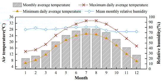 The investigation was carried out in the naturally ventilated residential buildings in a rural region of Hezhou city, which is located in the east of the Guangxi Zhuang Autonomous Region (as shown in Figure 1), between E 111°05′–112°03′ and N 23°39′0″–25°09′0″. The location is in the northern area of an HSWW zone [32]. Hezhou experiences a subtropical monsoon climate characterized by strong solar radiation, a long frost-free period, and abundant rainfall. From 1981 to 2010, Hezhou experienced an average air temperature reaching 20.2 °C annually. The hottest month was July, averaging 28.6 °C, whereas January was the coldest, with an average of 9.3 °C. The annual mean rainfall recorded was 1561.7 mm. The monthly mean relative humidity is typically above 70% throughout the year. The monthly average outdoor relative humidity can reach as high as 81% in July and August, and the lowest relative humidity typically stands at 72% from October to December. During summer, with elevated heat levels, substantial humidity, sultry weather, and regular rainfalls, Hezhou’s climate is well-defined. Figure 2 provides an overview of the meteorological data reflecting an average year for the region.