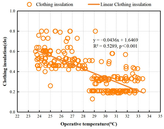 Figure 5 demonstrates the correlation of clothing insulation with indoor top as well as the corresponding linear regression findings. The insulation values ranged from 0.13 clo to 0.8 clo, with an average of 0.41 clo. In Figure 5, there is a clear pattern indicating that clothing insulation tended to decrease as top increased. When the top increased by 1 °C, the clothing insulation decreased by 0.0436. The Pearson correlation coefficient of 0.727 (p < 0.001) confirms a strong linear correlation between these two variables.