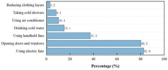 To enhance thermal comfort, local rural residents adopt various cooling strategies to adapt to high temperatures. As shown in Figure 6, the most common cooling approaches are using electric fans (82.9%) and opening doors and windows (80.5%), indicating a strong reliance on cost-effective cooling solutions. Other strategies, in descending order, include using handheld fans (37.5%), drinking cold water (15.1%), using air conditioning (10.4%), taking cold showers (8.4%), and reducing clothing layers (3.2%). The large disparity between electric fan usage (82.9%) and air conditioning (10.4%) underscores a clear preference for cost-effective, energy-efficient cooling methods over more expensive technological options in rural Hezhou.