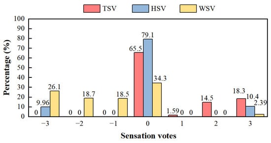 Figure 7 shows distributions of TSV, HSV, and WSV. Most respondents reported that a neutral thermal sensation and a neutral humidity sensation accounted for 65.5% and 79.1%, respectively. The sensation categories of (−1, 0, +1) are commonly associated with a comfortable state [55]. According to the survey findings, over 67% of the votes fell into the TSV comfort range, while only 53% fell into the WSV comfort range.