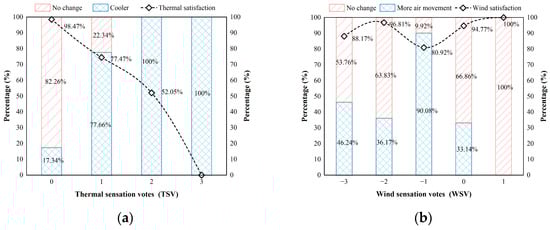 Additionally, the crosstab relationships of sensation, preference, and acceptability in terms of thermal and wind sensation were analyzed, as shown in Figure 8a and Figure 8b, respectively. Figure 8a shows that among the subjects with a slightly warm thermal sensation, 77.47% accepted the current thermal environment, while 77.66% expected the current environment to be cooler, and 22.34% expected it to be warmer. Figure 8b shows that among the subjects with a very still and moderately still wind sensation, most of them accepted the current natural ventilation atmosphere.