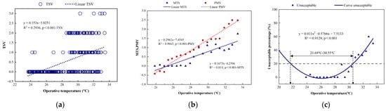 The quantitative relationship of the thermal sensation vote (TSV) and indoor operative temperature is calculated as Equation (3). Weighted binned linear regression (binning top values into 0.5 °C intervals with weighting determined by the sample size of each group) is adopted in the present paper [54].