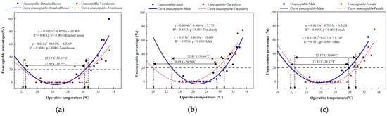 The highest limit of acceptable temperature (80%). (a) Building type; (b) Age; (c) Gender.