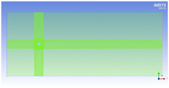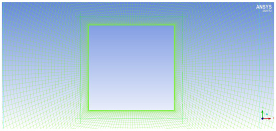To validate the feasibility and accuracy of this numerical simulation, Table 1 summarizes the results of relevant studies conducted by other researchers, which are compared with the results of the numerical simulation. To verify the effect of grid resolution on the simulation results, three different grid densities were used for comparison. The coarse, standard, and fine grids were defined as WG1, WG2, and WG3, with grid counts of 32,000, 43,000, and 51,000, respectively. The grids were generated using ICEM and consisted of a structured mesh. Mesh refinement was applied near the boundary layer of the square cylinder and along the vortex trajectory. In ICEM, the node distribution pattern and number of nodes are set, and the number of nodes is increased to achieve refinement. The y+ value of the grid was set to 1. The overall computational domain mesh is shown in Figure 3, and the refined mesh around the square cylinder is shown in Figure 4.