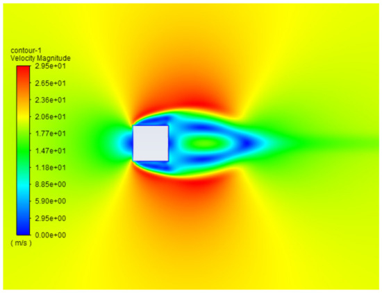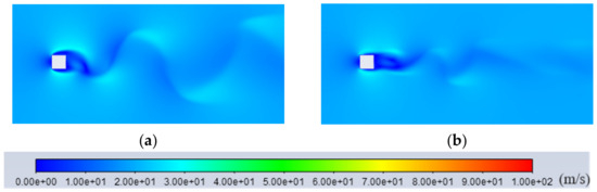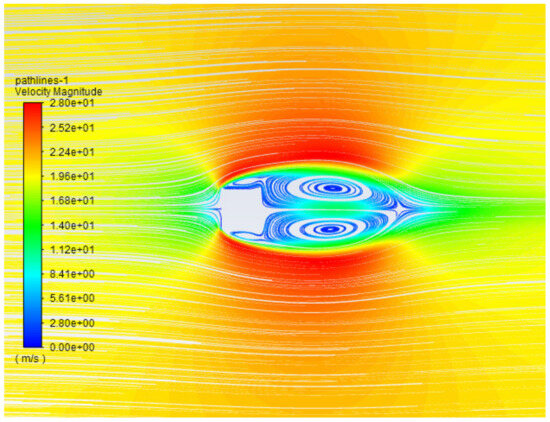 The flow field around a square cylinder without a jet was simulated, and the characteristics of the flow field under no-jet condition were obtained for comparison with the synthetic jet control effect. As shown in Figure 5, when the fluid flows over the front surface of the square cylinder, the flow separates at two windward angles due to the obstruction caused by the column. This flow separation creates a low-pressure region on the leeward side of the square cylinder, which triggers the formation of vortices. The velocity streamline diagram in Figure 6 shows that two symmetrically placed vortices were generated on the leeward side of the square cylinder. Figure 6 also reveals the presence of smaller vortices on both sides of the column, which may result from the boundary layer between the column surface and the surrounding air. Within the boundary layer, the flow is influenced by surface friction and turbulence, resulting in velocity gradients and turbulent vortices.