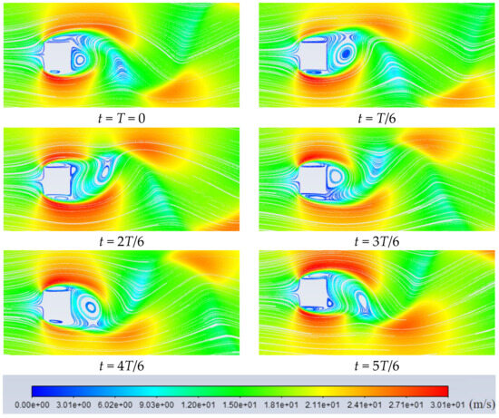 Figure 7 shows the vorticity contour plot of a complete vortex-shedding cycle T. From the figure, it can be seen that the vortex shedding follows a “2S” shedding mode. At t = 0 (t represents the simulation time), the vortex sheds from the lower side of the leeward surface of the square cylinder. At t = T/6, the vortex moves backward along the wake line and continues to develop. During this process, the upper vortex gradually forms and sheds at t = 3T/6. After shedding, it similarly moves backward along the wake line and continues to develop. At this point, the lower vortex begins to form again. After the vortex sheds at t = 5T/6, the cycle returns to the initial state at t = 0. The subsequent flow field continues to cycle through this process, forming periodic vortex shedding, which can also be observed in the lift and drag coefficient time history plots of the square cylinder later in the text. Figure 8 presents the corresponding velocity streamline diagrams for each moment of the vorticity contour plot throughout the entire cycle. By combining both figures, it can be observed that as the vortices alternate shedding from the upper and lower sides, the velocity streamlines in the wake of the columnalso change accordingly. The location of the vortices creates a noticeable recirculation zone. There are two reasons for this phenomenon: First, the rotational motion of the vortex creates a closed pathline structure within it. On the downstream side of the vortex, the fluid is driven by the vortex rotation to move in the upstream direction, thereby forming a reverse flow. Second, the core region of the vortex is a low-pressure zone caused by the centrifugal effect of rotational flow. The low-pressure core attracts the surrounding fluid to move toward the vortex center, thus forming a reverse flow. The formation and maintenance of a vortex require energy, leading to lower kinetic energy in the vortex region compared to other areas. The vortex core is a low-pressure region, and the low pressure attracts the surrounding fluid toward the center. However, owing to the constraints of rotational motion, the fluid cannot enter the core area quickly, resulting in a lower velocity in the core region. The core of the vortex (the center) is the area with the minimum fluid velocity, which may even approach zero. The momentum in the vortex region is concentrated on the outer part of the vortex, while the momentum closer to the center gradually decreases, leading to a reduction in velocity at the core. Additionally, the position of the vortex forms a backflow region where reverse flows influence the fluid velocity. The closer to the vortex center, the more significant the reverse motion of the fluid, and consequently, the fluid velocity is lower.