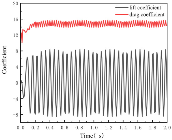 Due to the periodic alternate shedding of vortices, the mean value of the lift coefficient is generally zero. Therefore, this study analyzes its fluctuation values. However, for the drag coefficient of the square cylinder, the fluctuation range is typically very small and remains relatively stable. Thus, its time-averaged value is analyzed. The calculation formulas for the lift and drag coefficients are provided in Equations (6) and (7).