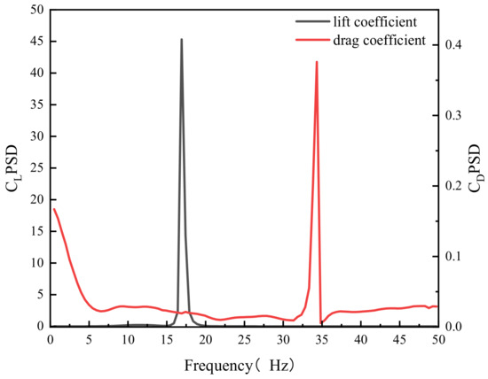 The time history of the lift and drag coefficients of the square cylinder under the no-jet condition is shown in Figure 9. From the figure, it can be observed that due to the periodic alternating shedding of vortices, both the lift and drag coefficients exhibit clear periodic behaviors. The fluctuation amplitude of the drag coefficient is relatively small because the lift coefficient is more strongly influenced by vortex shedding, and its fluctuation frequency typically synchronizes with the shedding frequency. In contrast, the drag coefficient is affected by the pressure difference between the front and rear of the column, and this pressure difference is more stable compared to vortex shedding. By applying Fast Fourier Transformation (FFT) to convert the time-domain data of the lift and drag coefficients into frequency-domain data, the power spectral density (PSD) spectrum is obtained. From Figure 10, it can be seen that the main frequency of the lift coefficient is 16.7 Hz, and that of the drag coefficient is 34.3 Hz. The main frequency of the lift coefficient is half of that of the drag coefficient, which aligns with the vortex-shedding pattern of the square cylinder and is consistent with aerodynamic fluctuation frequency relations. The main frequency of the lift coefficient is half that of the drag coefficient because, in the case of vortex-induced vibrations of the square cylinder, the shedding and alternating detachment of vortices from the column’s surface in the wake region cause the drag to change in the downstream direction with each vortex shedding. However, only when both the upper and lower vortices have shed will the cross-flow direction lift change. Therefore, during the entire vortex-shedding cycle from the column surface, the number of drag coefficient changes in the downstream direction is twice the number of lift coefficient changes in the cross-flow direction. The main frequency of the lift coefficient, or the natural vortex-shedding frequency of the square cylinder, is 16.7 Hz, which will be used in subsequent calculations to determine the synthetic jet excitation frequency.