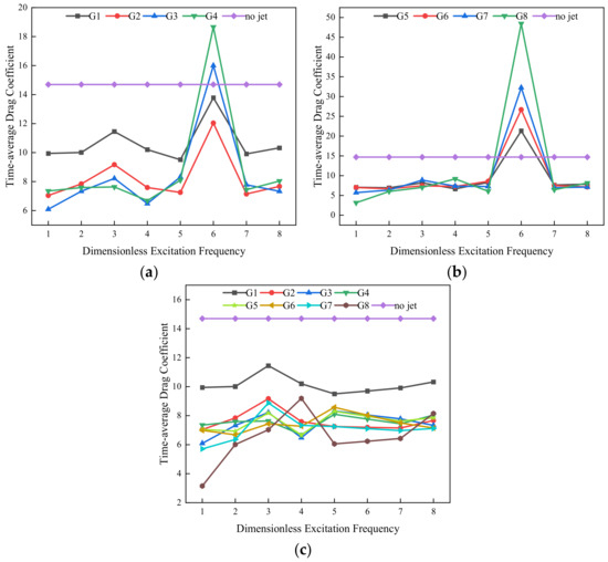 By taking the average of the drag coefficient values at dimensionless excitation frequencies of 5 and 6 for each condition, we obtain the diagram in Figure 12c. It can be observed that except for G1 and G8, the time-averaged drag coefficients for the remaining conditions follow a similar trend with increasing excitation frequency, and their values are also relatively close. This indicates that after the synthetic jet is applied, the variation in the drag coefficient is not significant.