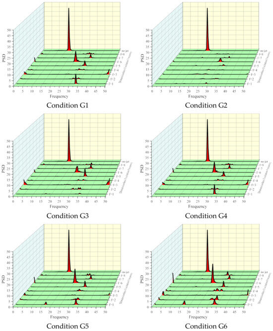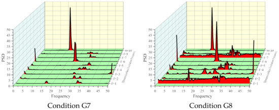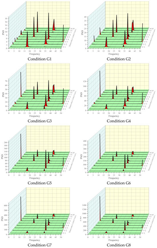 Figure 13 presents the power spectral density (PSD) diagrams of the lift coefficient for conditions G1 to G8, where the synthetic jet is located at the flow separation point. From the previous discussions, it is known that the natural vortex-shedding frequency of the square cylinder is 16.7 Hz, which is evident in the PSD for the no-jet condition, where a prominent peak appears at this frequency. Upon comparison, it is observed that after the synthetic jet is activated, the peak of the PSD decreases to varying extents, and the dominant frequency shifts. Under certain conditions, the spectral range gradually broadens, indicating that the flow becomes more complex and its non-periodic characteristics are enhanced.