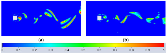 As shown in Figure 11a,b, under the G8 condition, the fluctuation amplitude of the lift coefficient is relatively large. Furthermore, for dimensionless excitation frequencies of 1, 3, 4, 6, and 7, the lift coefficient is greater than that under the no-jet condition. At a dimensionless excitation frequency of 1, the lift coefficient reaches a maximum value of 14.45, which is approximately 2.5 times higher than that under the no-jet condition. In contrast, under other conditions, the lift coefficient of the square cylinder decreases. This is because when f = 1, the frequency of the jet matches the natural vortex-shedding frequency of the square cylinder. This frequency matching induces a resonance effect. During resonance, the jet can effectively enhance the vortex-shedding process of the square cylinder, generating larger periodic flow fluctuations and thereby increasing the lift coefficient. When f ≠ 1, the frequency of the synthetic jet differs from the vortex-shedding frequency, and the control effect of the jet on the flow field weakens. The synthetic jet suppresses or disrupts vortex shedding, leading to a reduction in lift. Specifically, under the G2 condition, the overall reduction in the lift coefficient is the most significant, with a minimum value of 1.26 at a dimensionless excitation frequency of 1, representing a 79% reduction in the lift coefficient.