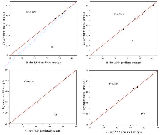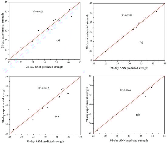 - A set of data consisting of 12 data points was used for validating the performance of the RSM models and ANN models by comparing the R2 of experimental values vs. RSM-predicted values and experimental values vs. ANN-predicted values. The higher R2 value indicates that the ANN has a better performance in the strength prediction of 28-day and 91-day strength.
