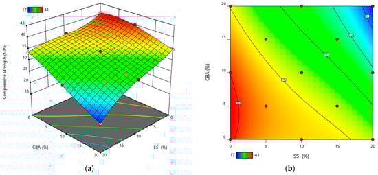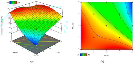 - By analyzing the 3D response-surface plots and 2D contour plots of 28-day and 91-day strength, it was found that the synergy between the pozzolanic properties of GCBA and the low hydration rate of SS resulted in a difference in the strength distribution at the 28-day and 91-day curing ages.