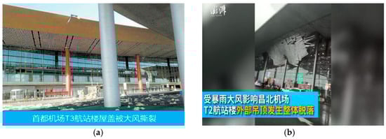 Some domestic airport terminals have suffered wind-induced damage incidents: (a) Capital Airport (China); (b) Changbei Airport (China).
