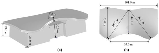 As important hubs for passenger traffic, airport terminals need to accommodate a large number of personnel, luggage, and cargo and are usually designed as large-span and spacious spaces. However, due to its lightweight, flexible, and low-damping characteristics, the roof’s structure is susceptible to wind loads, posing challenges to wind-resistant design. Wind load has become a key factor in designing the long-span roof (LSR). Due to wind effects, the roof structure is often damaged, especially the enclosure structure [1,2,3,4] (see Figure 1). For example, the roof of Terminal T3 of Capital Airport was torn by strong wind, and the ceiling of Terminal T2 of Changbei Airport fell off due to rainstorms and strong wind. These damages not only cause property damage but also endanger personal safety. Hence, it is particularly important to explore the distribution feature of wind pressure (air pressure) on the terminal building roof. To cope with the impact of wind loads, various structural optimization methods have been adopted in roof design, among which roof opening is an effective solution. Roof openings can reduce the impact of wind loads by adjusting the distribution of wind pressure [4,5,6], especially under strong winds, which can prevent roof materials from tearing or falling off. The reasonable setting of openings can effectively alleviate wind pressure, avoid the formation of local high-pressure areas, reduce the risk of roof damage, and improve the stability of the structure [7,8,9]. In addition, roof openings have advantages such as improving lighting, reducing dependence on artificial lighting, optimizing indoor environmental comfort, enhancing energy efficiency, and reducing energy consumption and emissions [10,11].
