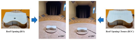 In terms of experimental conditions, two types of conditions were set up—roof opening and the closure of the airport terminal roof—and 12 small conditions were set within the wind orientation angle from 0° to 180° (symmetrical on two sides of the roof) at intervals of 15° for each condition. The specific test condition data are shown in Table 1.