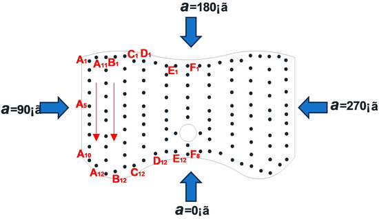 The wind tunnel assay of the LSR’s rigid model in the airport terminal was implemented at the XNJD-1 Wind Tunnel Laboratory of Southwest Jiaotong University. The section size for the wind tunnel assay was 8.0 m (L) × 3.6 m (W) × 3.0 m (H). The sampling frequency of the experiment was 256 Hz, and the sampling duration was 60 s. A total of 128 pressure measuring points were symmetrically arranged on the surface of the roof, and a Scanivalve electronic scanning valve was used for real-time wind pressure measurement. Meanwhile, the length of the pressure measuring tube was controlled within 20 cm to ensure that the experimental requirements were met. Figure 4 displays the distribution of measured points and the setting of wind orientation angles for the model.