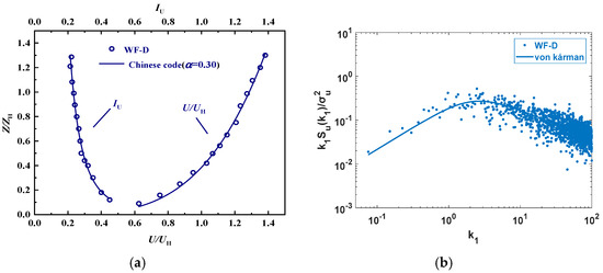 According to the provisions of GB 50009-2012 “Code for Load of Building Structures” [16,40,41,42], a Class D wind field was simulated with a scale of 1:200 (with a ground roughness index of α = 0.3). To accurately mimic the wind field (WF) setting undergone by the terrain, sharp edges and rough elements were utilized for WF simulation in wind tunnel assays. The average wind velocity and turbulence intensity profiles of the simulated D-class atmospheric boundary WF are shown in Figure 5a. Among them, is the wind velocity, Z expresses the height, signifies the turbulence intensity, stands for the model reference point wind speed, and is the height of the model reference point. The simulated pulsating wind power spectrum is shown in Figure 5b, where k1 indicates the reduced frequency. The findings in Figure 4 reveal that the experimental values of the average wind velocity profile and turbulence intensity profile correspond to the standard values, and the experimental values of the varying wind velocity power spectrum conform with the von kárman spectrum, suggesting that the simulated WF meets the experimental requirements [23,43,44].