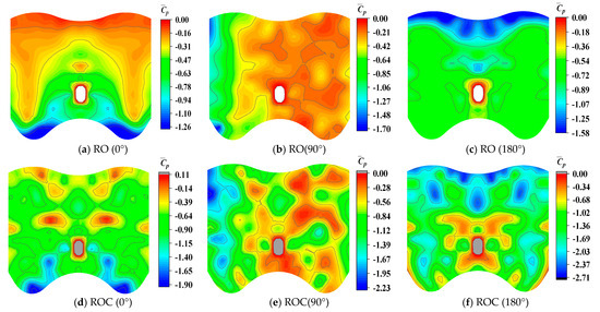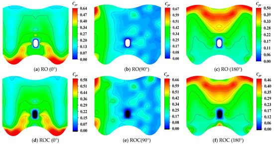 Cloud map of mean wind pressure coefficient for roof opening and closure under typical wind direction angles: (a–c): at = 0°, 90° and 180° (Roof Opening); (d–f): at = 0°, 90° and 180° (Roof Opening Closure).
