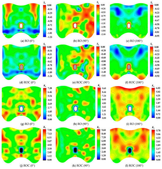 Wind pressure skewness and kurtosis cloud maps of roof opening and closure under typical wind direction angles: (a–f): at = 0°, 90° and 180° (roof opening and roof opening closure); (g–l): at = 0°, 90° and 180° (roof opening and roof opening closure).
