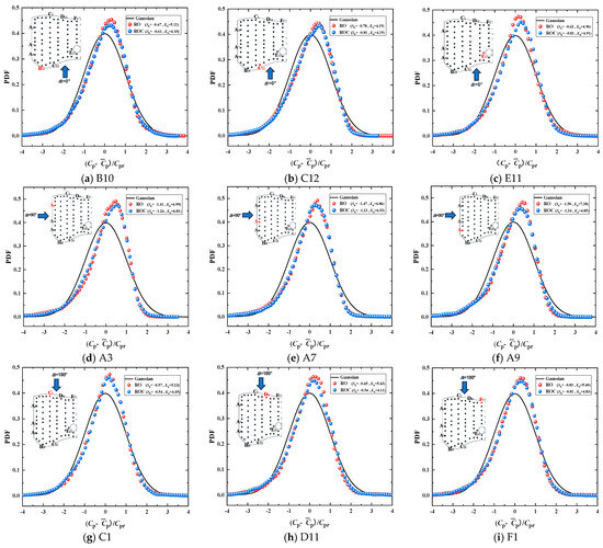 To further explore non-Gaussian features of wind pressure on roof opening and closure, Figure 9 exhibits the probability distribution functions of fluctuating wind pressure at common measured points (with measured point sites and quantity displayed in Figure 4) for roof opening and closure at = 0°, 90°, and 180°, and contrasts them with the Gaussian distribution curve. The vertical axis represents the probability density PDF of varying wind pressure, and the horizontal axis represents the normalized wind pressure coefficient of the data. In Figure 10a–i, it can be seen that under the two working conditions of roof opening and closure, the typical measuring points around the roof’s windward front edge and circular hole diverge remarkably from the Gaussian distribution curve, exhibiting significant non-Gaussian characteristics. Meanwhile, as shown in the figure, compared to the roof opening closure condition, the probability density of wind pressure at most measured points under the roof opening condition deviates more from the standard Gaussian distribution, with maximum deviations of 23.1%, 23.5%, and 20.8% (A3, A7, A9), respectively. This indicates that the impact of roof openings on non-Gaussian features of wind pressure was more significant. For this phenomenon, we suggest considering using aerodynamic optimization structures when designing roof openings, such as improving the smoothness of the windward leading edge or adopting curved roof designs, to reduce the instability and extreme fluctuations of wind pressure.