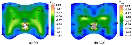 This study obtained the most disadvantageous extreme WP coefficients for both roof opening and closure conditions at all wind angles and obtained the extreme WP coefficients for the entire wind angles. Figure 11 shows the envelope cloud map of the minimal WP coefficient for the full wind direction angle under two conditions. The findings suggest that the distribution of the most unfavorable negative pressure extreme values under two conditions shows a clear pattern, with smaller negative pressures usually occurring in the flow separation area on the windward side at various wind direction angles. Moreover, by comparing the worst-case negative pressure extreme values of the two working conditions, it can be found that the influence range of the roof closure on the extreme WP on the roof surface is wider, while the impact of the roof opening in the worst-case negative pressure is more significant. Specifically, the worst-case extreme negative pressure coefficient under the condition of roof opening is −4.54, which is 1.3% lower than the worst-case extreme negative pressure under the condition of roof opening closure. Therefore, roof openings will lead to a decrease in the minimum negative pressure under the most unfavorable working conditions. The overall deviation of the most unfavorable extreme wind pressure is not significant. For these results, we suggest that when designing roofs, especially for roof openings, the impact of airflow separation and wind pressure fluctuations on the stability of the roof structure should be fully considered. It is possible to consider optimizing the geometric shape of the roof and using aerodynamic design measures (such as adding turbulence devices near openings) to reduce negative pressure fluctuations and improve the wind resistance performance of the roof.