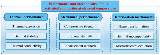 In recent years, the mechanical characteristics of alkali-activated composites at elevated temperatures have garnered significant attention from a diverse range of scholars [34,35,36]. However, a systematic overview of this research area remains insufficient. Furthermore, existing review papers regarding the properties of geopolymers subjected to high temperatures often overlook the influence of thermal properties on mechanical performance and fail to adequately summarize the damage mechanisms associated with the deterioration of mechanical properties in geopolymers under such conditions. Therefore, this paper aims to provide a comprehensive summary of the thermal and mechanical properties of alkali-activated composites at elevated temperatures as well as an analysis of the damage mechanism underlying the performance degradation of alkali-activated concrete at elevated temperatures. The goal is to identify the key challenges faced by alkali-activated composites in the study of resistance to high temperatures and to provide comprehensive information for the study of the fire resistance of alkali-activated concrete structures, thereby promoting the application of AAMs in the field of structural engineering. The research framework of this paper is illustrated in Figure 1.