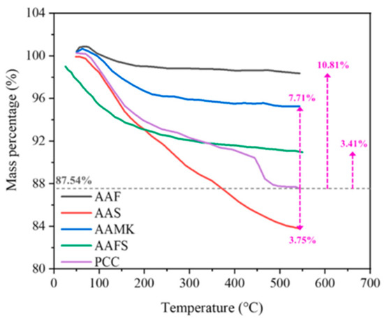 The thermal stability of alkali-activated composites plays a vital role in their performance at raised temperatures [18,21]. Rivera et al. [2] utilized thermogravimetric analysis (TGA) to compare the mass loss of alkali-activated pastes with different systems with cement-based slurries, as illustrated in Figure 3. It is evident that the mass loss of each paste system gradually increased with rising temperature. Among these paste systems, AAS pastes exhibited the highest mass loss, followed by Portland cement concrete (PCC) pastes, AAFS pastes, AAMK pastes, and AAF pastes, respectively. After exposure to elevated temperatures of 550 °C, the mass loss of AAS was 3.75% higher than that of the PCC paste, while the mass losses of the AAF, AAMK, and AAFS pastes were 10.81%, 7.71%, and 3.41% lower than that of the PCC pastes, respectively, as demonstrated in Figure 3. This mass loss occurred progressively due to the volatilization of H2O from various physically and chemically adsorbed states within the hydrates [41,54]. Notably, there are distinctions in the mass loss mechanisms between cement slurries and alkali-activated slurries. In cement pastes, the loss of weight at about 100 °C is primarily ascribed to the evaporation of free water and the dehydration of ettringite. Subsequently, the rapid mass loss of cement pastes at about 450 °C is predominantly linked to the dehydration of Ca(OH)2 and the release of H2O from the C-S-H gel in various adsorbed states [34]. Burciaga-Díaz et al. [55] determined that the slopes of weight curves for cement pastes at 425 and 700 °C aligned with the peak of heat absorption via differential thermal analysis, attributed to the decomposition of CaCO3 and the dehydration of Ca(OH)2.