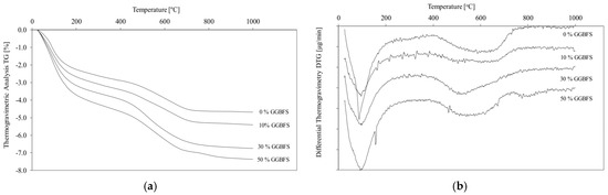 TGA and DTG curves of AAF mortars [59]. (a) TGA and (b) DTG.