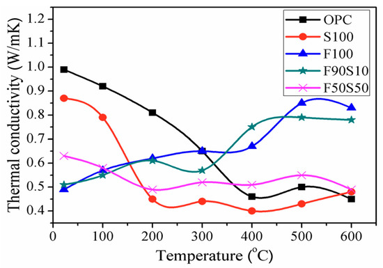 Thermal conductivity holds a pivotal role in determining the distribution of the structural temperature field during a fire incident, thereby influencing the mechanical behavior of a structure under such conditions [60]. Previous studies have highlighted that the thermal conductivity of AAMs at room temperature is inferior to that of conventional building materials and comparable to commercially available fireproofing materials [27]. Notably, at elevated temperatures, the thermal conductivity behaviors of AAMs and OPC diverge significantly. The thermal conductivity of OPC decreases with rising temperatures, whereas that of AAMs increases with increasing temperature, primarily due to distinct alterations in porosity at high temperatures [60]. Pan et al. [61] investigated the effect of the fly ash content on the thermal conductivity of AAS pastes at elevated temperatures. It was found that the thermal conductivity of alkali-activated fly ash-slag (AAFS) composites decreased gradually with increasing temperature and when the fly ash content was less than 50%, while the thermal conductivity of alkali-activated fly ash (AAF) pastes and AAFS pastes with a mixture of 90% fly ash and 10% slag (F90S10) demonstrated a certain increase with the increase in the exposure temperature, as depicted in Figure 5.