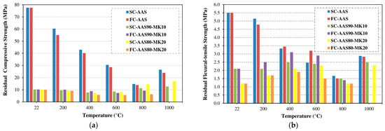 Due to the diverse range of aluminosilicate precursors, the degradation patterns of alkali-activated composites from different systems subjected to high temperatures vary considerably. Generally, alkali-activated composites with high-calcium systems (e.g., slag) exhibit superior mechanical properties compared to those with low-calcium systems (e.g., fly ash and metakaolin), but their resistance to high temperatures is relatively inferior [63,85]. Hager et al. [59] investigated the impact of varying slag contents on the resistance to high temperatures of alkali-activated fly ash (AAF) mortars. They found that while the inclusion of slag significantly enhanced the mechanical properties of AAF mortars, the mortars without slag performed better under high-temperature conditions. Specifically, after being subjected to high temperatures of 1000 °C, the compressive strength, flexural strength, and elastic modulus of AAF mortars degraded by 8%, 27.0%, and 60.1%, respectively, while those of AAFS mortars incorporating 30% slag experienced reductions of 70.5%, 71.2%, and 90.7%, respectively. Akçaözoglu et al. [52] explored the effects of the metakaolin content and cooling methods on the resistance to high temperatures of alkali-activated slag (AAS) mortars. Their findings indicate that the residual compressive and flexural strengths of the specimens decreased with the increase in temperature, while the porosity and water absorption increased. As the metakaolin content increased, the decreases in the compressive and flexural strengths of the AAS mortars decreased significantly. When the metakaolin content was 20%, the compressive strength of the AAS mortars decreased from 77 MPa to 11 MPa, while their flexural strength decreased from 5.5 MPa to 1.2 MPa. Although the addition of metakaolin considerably reduced the mechanical characteristics of the alkali-activated mortars, it improved their resistance to high temperatures. The compressive strength and flexural strength of the alkali-activated mortars without metakaolin were reduced by 80.7% and 69.4%, respectively, after exposure to 800 °C, whereas those of the alkali-activated mortars with 20% metakaolin (AAS80-MK20) were reduced by only 34.8% and 1.5%, respectively, as illustrated in Figure 7. Additionally, Kuri et al. [74] examined the resistance to high temperatures of alkali-activated fly ash–slag (AAFS) pastes with varying ratios of ground ferronickel slag to fly ash (0/100, 25/75, 50/50, and 75/25). They found that the pastes composed of 50% slag and 50% fly ash exhibited higher residual strength with fewer voids and cracks. The amorphous content of the alkali-activated paste with this composition decreased from 79.6% at ambient temperature to 75.5%, 73.7%, and 53.1% at temperatures of 200 °C, 600 °C, and 1000 °C, respectively.