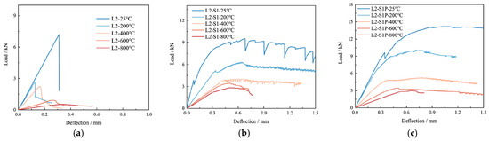 Load–deflection curves of specimens at different temperatures [84]. (a) Control group; (b) 1% steel fiber; (c) 1% steel fiber + 2% PP fiber.