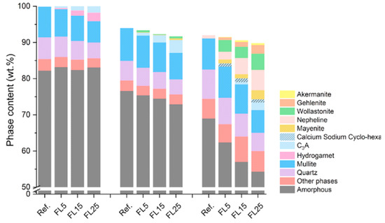Ponomar et al. [58] compared fayalite slag (FS) and labelled wüstite slag (WS) as precursors to the crystalline phase changes in alkali-activated pastes at high temperatures. It was found that the content of the crystalline phases formed by the different systems of AAS pastes was different at each temperature (see Figure 11), with an 8% nepheline crystalline phase formed in WS-based AAS pastes and a 21% diopside crystalline phase formed in FS-based AAS pastes at 1000 °C. In addition, the formation of crystalline phases in AAFS pastes is strongly related to the ratio of slag to fly ash. Luo et al. [97] investigated the formation of crystalline phases of AAFS pastes with various slag contents (0, 5, 15, and 25%). It was found that as the slag content increased, the formed crystalline phases (i.e., wollastonite, nepheline, akermanite, and gehlenite) at 800 °C increased gradually, as plotted in Figure 12.