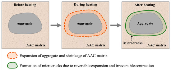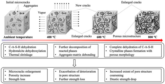 The reaction mechanism of alkali-activated composites is generally considered more complex compared to that of cement-based concrete [97]. High temperatures can induce a series of chemical and physical changes in alkali-activated composites, which induce cracks on the surface of the concrete, ultimately impacting their strength under elevated-temperature conditions [18]. Figure 10 shows the changes in appearance of alkali-activated concrete after high-temperature exposure. It can be observed that the concrete surface shows different color changes after exposure to high temperatures. Cracks of a larger width can be observed on the concrete surface after exposure to 800 °C [83]. In general, the damage mechanism of alkali-activated composites at high temperatures shares similarities with that of cement-based concrete, characterized by three primary factors [23]. Firstly, crystalline-phase transformation occurs in alkali-activated composites at various temperatures, leading to the formation of new crystalline phases [27]. The emergence of weaker phases can diminish the strength of alkali-activated composites, while the development of stable phases resistant to high temperatures can enhance the strength of geopolymers. Secondly, displacement incompatibility arises in alkali-activated composites under high-temperature conditions due to temperature gradients within the material [98]. The extent of these gradients is influenced by the material’s heat transfer capabilities and heat capacity, causing displacement disparities between the exterior and interior of alkali-activated composites. Additionally, variations in thermal expansion among different aluminosilicate materials in alkali-activated composites can generate displacement incompatibility when temperatures fluctuate, contributing to crack formation and subsequent strength reduction [53]. Lastly, microstructural changes play a crucial role in determining the strength of alkali-activated composites under high-temperature exposure [99]. An increase in porosity and pore diameter leads to significant strength deterioration in alkali-activated composites, whereas a decrease in porosity and pore size results in less pronounced strength loss. These three influencing mechanisms will be further elucidated in the subsequent discussion.