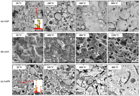 Figure 13 demonstrates the damage evolution of AAF and AAFS pastes at various temperatures. Before high-temperature exposure, the AAFS pastes were more compact with less residual moisture and unreacted particles than the AAF pastes, which may be attributed to the addition of slag that sped up the reaction process and made the matrix denser [28]. However, the AAF pastes were able to remain stable at temperatures ranging from 100~600 °C without any significant loss of structural integrity or change in the crystalline phase. The AAFS pastes, on the other hand, developed new cracks and extended their existing cracks caused by pore pressure trapped in the internally porous compact structure. At 600 °C, the AAF pastes exhibited matrix shrinkage and viscous sintering, while the AAFS pastes underwent gel decomposition, and the slag formed a mixed N/C-A-S-H gel with low thermal stability. The decomposition of this mixed gel led to the development of fine cracks, which significantly reduced the strength of the AAFS pastes at this stage. At 800 °C, both the AAF pastes and AAFS pastes formed a new crystalline phase. The recrystallization process weakened the gel skeleton and made its texture less dense, while the sintering reaction continued to densify and strengthen the AAM matrix by filling cracks and pores [97]. As a result, a combined effect of strength loss and increase occurred in the AAMs at this stage. In contrast, the AAFS pastes were more affected by matrix decomposition, leaving more cracks and voids and, therefore, more significant strength loss. Overall, the gel structure of AAFS pastes is more complex and less stable than that of AAF pastes.