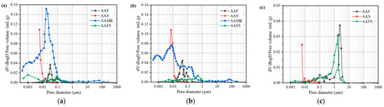 It is worth pointing out that the mass loss of alkali-activated composites is strongly influenced by the type of aluminosilicate precursor, primarily due to the varying compositions in each alkali-activated system, encompassing amorphous and crystalline phases [36,52]. Among these alkali-activated systems, AAS pastes exhibit the highest mass loss compared to the AAF and AAMK pastes, registering a mass loss rate of approximately 16% after exposure to elevated temperatures of 550 °C, as illustrated in Figure 3. This heightened mass loss in the AAS paste can be attributed to its high calcium content, which imparts lower thermal stability compared to other alkali-activated systems, consequently resulting in the production of additional hydrated phases. Upon reaching 800 °C, AAS pastes undergo a sudden mass loss due to calcite and hydrocalcite decomposition [56,57]. Conversely, the relatively elevated water/solid ratio and the volatilization of free and absorbed water from the aluminosilicate gel phase are the primary factors driving mass loss in AAMK pastes.
