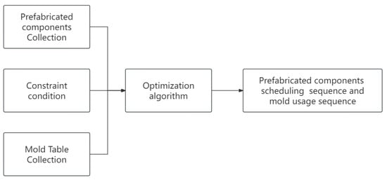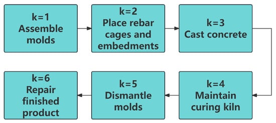 Figure 8. When applying the improved NSGA-II to solve the multi-objective optimization problem of prefabricated component production, the scheduling plan is represented by chromosomes. The process also involves encoding and decoding, establishing an initial population, constructing a fitness function, and performing selection, crossover, and mutation operations on chromosomes. The details of each step in the process are as follows: