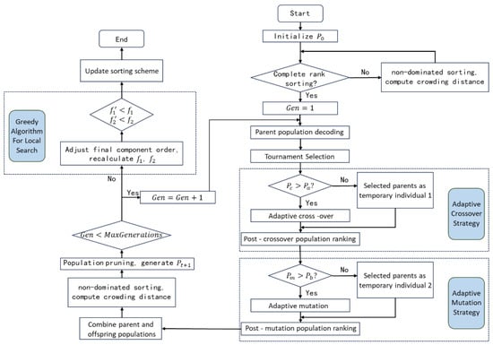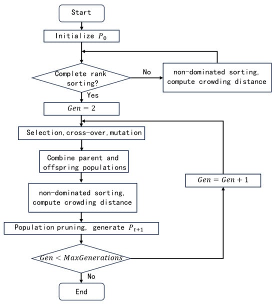 33] to address the limitations of the original NSGA. NSGA-II introduces the concept of fast non-dominated sorting and an elite strategy, significantly reducing computational complexity, accelerating convergence, and eliminating the need for manually set sharing parameters through the introduction of crowding distance, thus reducing solution errors and enhancing the overall performance and practicality of the algorithm.