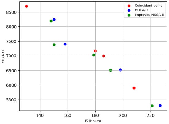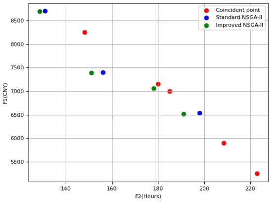 In the NSGA-II, an implicit elite preservation strategy is employed. This strategy involves merging the current parent population () with the offspring population generated (), forming a new population () of double the original size (), where N is the fixed number of individuals in the population. Subsequently, all individuals in the new population undergo fast non-dominated sorting and crowding distance calculation. Based on these rankings and crowding distances, the top N individuals are selected to form the new parent population . Following this, the next generation of offspring is produced through genetic operations such as replication, crossover, and mutation. This elite preservation strategy ensures that superior individuals are retained and participate in the reproduction of the next generation, thereby accelerating the algorithm’s convergence and maintaining the quality of solutions. Not only does this strategy enable the NSGA-II algorithm to effectively maintain population diversity, but it also prevents the algorithm from prematurely converging to local optima. Furthermore, by stratifying the population and calculating crowding distances, the search process is better guided to identify optimal solutions on the Pareto front.