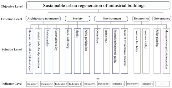 The AHP method combines qualitative and quantitative research, utilizing a hierarchical and systematic structure [78]. Its main advantage lies in its hierarchical diagram, which succinctly presents complex multi-objective and multi-level assessments, clearly expressing the relationships between various factors. It is widely applied across different fields due to its practicality and effectiveness in addressing complex decision-making problems [79]. The adaptive reuse of industrial buildings involves multiple dimensions and scales, representing a complex urban system. AHP addresses these complex decision-making issues by constructing a structure that links the main objectives to various levels of indicators [80]. The hierarchical structure model (Figure 2) includes the goal layer, criterion layer, solution layer, and factor layer.
