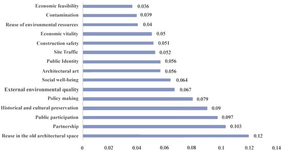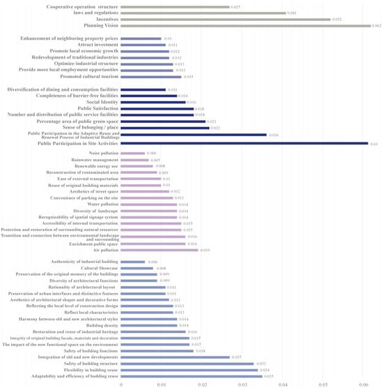 In the environmental dimension, air pollution (B21) holds the highest weight (0.019). Restoring old buildings not only optimizes land use but also reduces construction pollution, minimizes material consumption, and promotes sustainable development [85]. Additionally, the redevelopment of polluted areas and the conservation of natural resources also deserve attention.